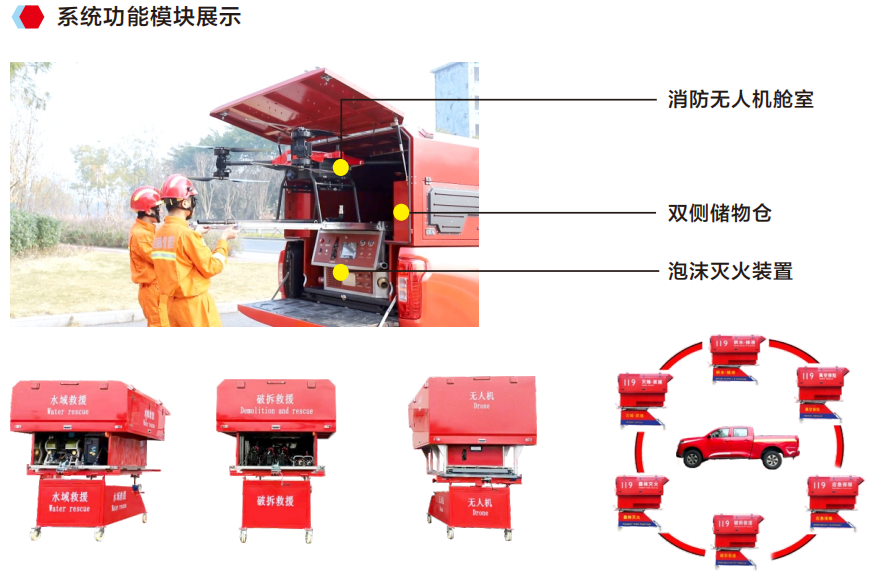 ¸ß¿ÕÃð»ð¾ÈÔ®¿ì·´ÏµÍ³ÒÔÆ¤¿¨³µÎªÔËÊäÆ½Ì¨£¬´îÔØ´óÔØÖØÎÞÈË»úCAFSÅÝı¬·¢ÏµÍ³µÈ¾ÈÔ®×°±¸×é³É£¬ÊµÏÖһվʽ³ö¾¯£¬¿ìËÙÕ¹¿ªÆËÃð¸ß²ã½¨ÖþÍâǽ»ðÔÖ£¬Í£Ö¹»ðÊÆÂûÑÓ¡£ ¸Ãϵͳ¿ÉʵÏÖ3·ÖÖÓ¿ìËÙÕ¹¿ª¾ÈÔ®£¬´îÔØAÀàÅÝÄϵͳ½øÐжàά¶È150Ã׸߿ÕÃð»ð£¬¾ß±¸ÆÆ´°¡¢Îï×ÊÅ×Ͷ¡¢¸ß¿Õº°»°¡¢Ò¹¼äÓ¦¼±ÕÕÃ÷µÈ¾ÈÔ®¹¦Ð§¡£